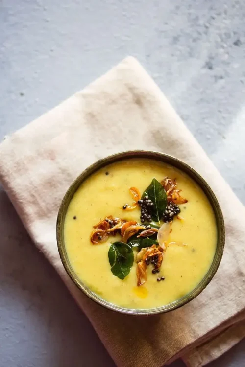 Split yellow lentils (toor dal) is cooked with a spiced coconut mixture.